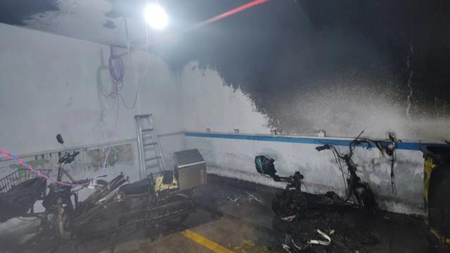现场总共设有5个充电位,事发时停放着多辆电瓶车。物业人员将其他几辆未着火的车辆及时搬出房间,避免了更大损失。一位居民向记者证实,其家人在凌晨5时左右来到地库取车时,听到了喷水声,还闻到一股难闻刺鼻的气味,这才得知发生了火灾。