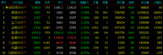 2026年1月14日,早盘开盘,国内期货主力合约多数上涨,沪银涨超6%,涨超5%,涨超4%,(LU)涨超3%,铂、钯、SC、纯苯涨超2%,(LPG)、涨近2%。跌幅方面,集运欧线跌超3%,跌超2%,、、、、跌超1%。