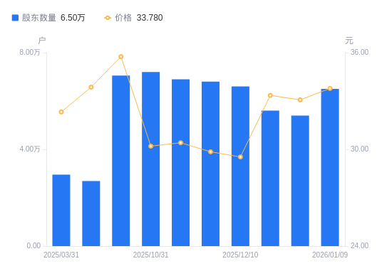 1月14日消息,数据显示,截至2025年12月31日,A股股东总户数为5.4万户,较上期(2025年12月20日)减少2000户,降幅3.57%。公司最新A股总股本为4.58亿股,其中流通A股4.58亿股,户均持有流通A股数量为8479.48股,较上期增加305.69股,增幅3.74%;户均持流通A股市值28.04万元,较上期增加7820.62元,增幅2.87%。