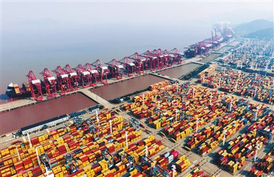 记者从宁波舟山港获悉,2025年宁波舟山港完成货物吞吐量超14亿吨,连续17年位居全球第一,宁波舟山港也由此成为全球首个年货物吞吐量超14亿吨的大港。图为宁波舟山港穿山港区(无人机照片)。