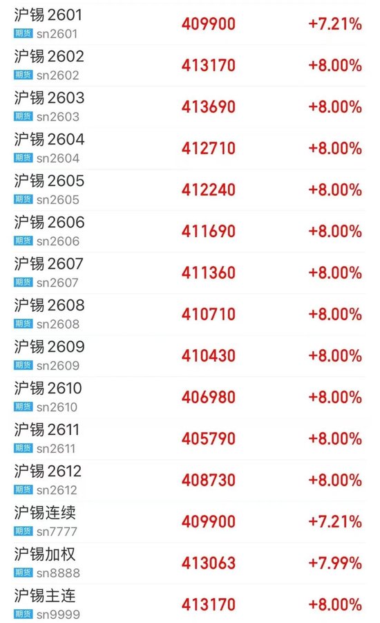 昨日夜盘时段,沪锡期货主力合约再度大涨,盘中一度突破44万元/吨大关,截至收盘上涨逾9%。