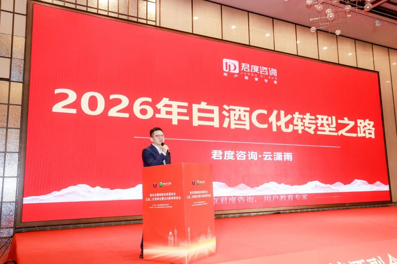 会议期间,北京君度咨询有限公司总经理云潇雨作《中国酒业消费趋势与陕西酒业破局之道》主题演讲。云潇雨从2026白酒行业观察、白酒企业 C 化转型之路等角度详细解读了2026年白酒 C 化转型之路。