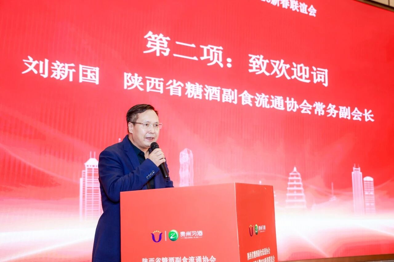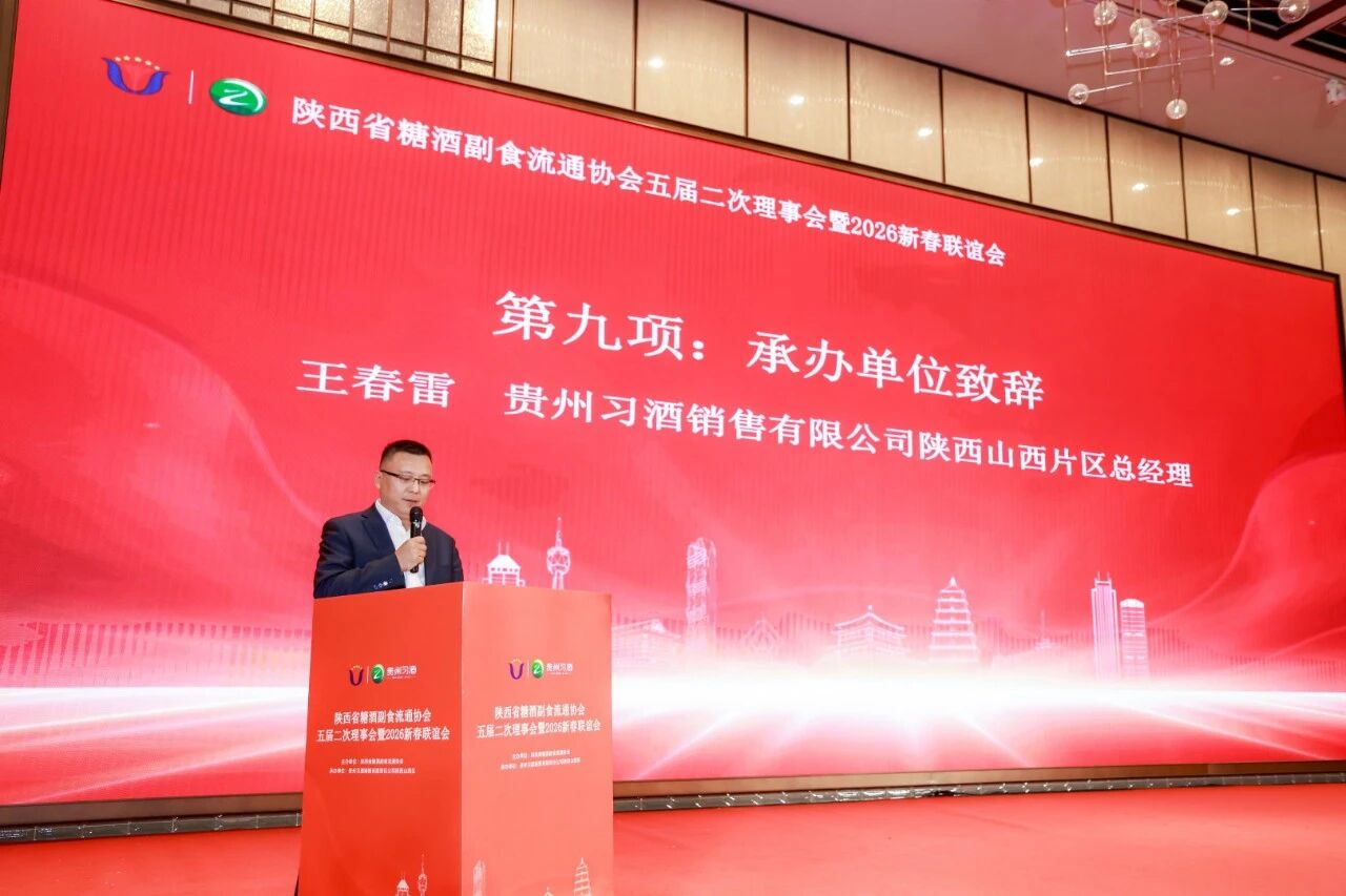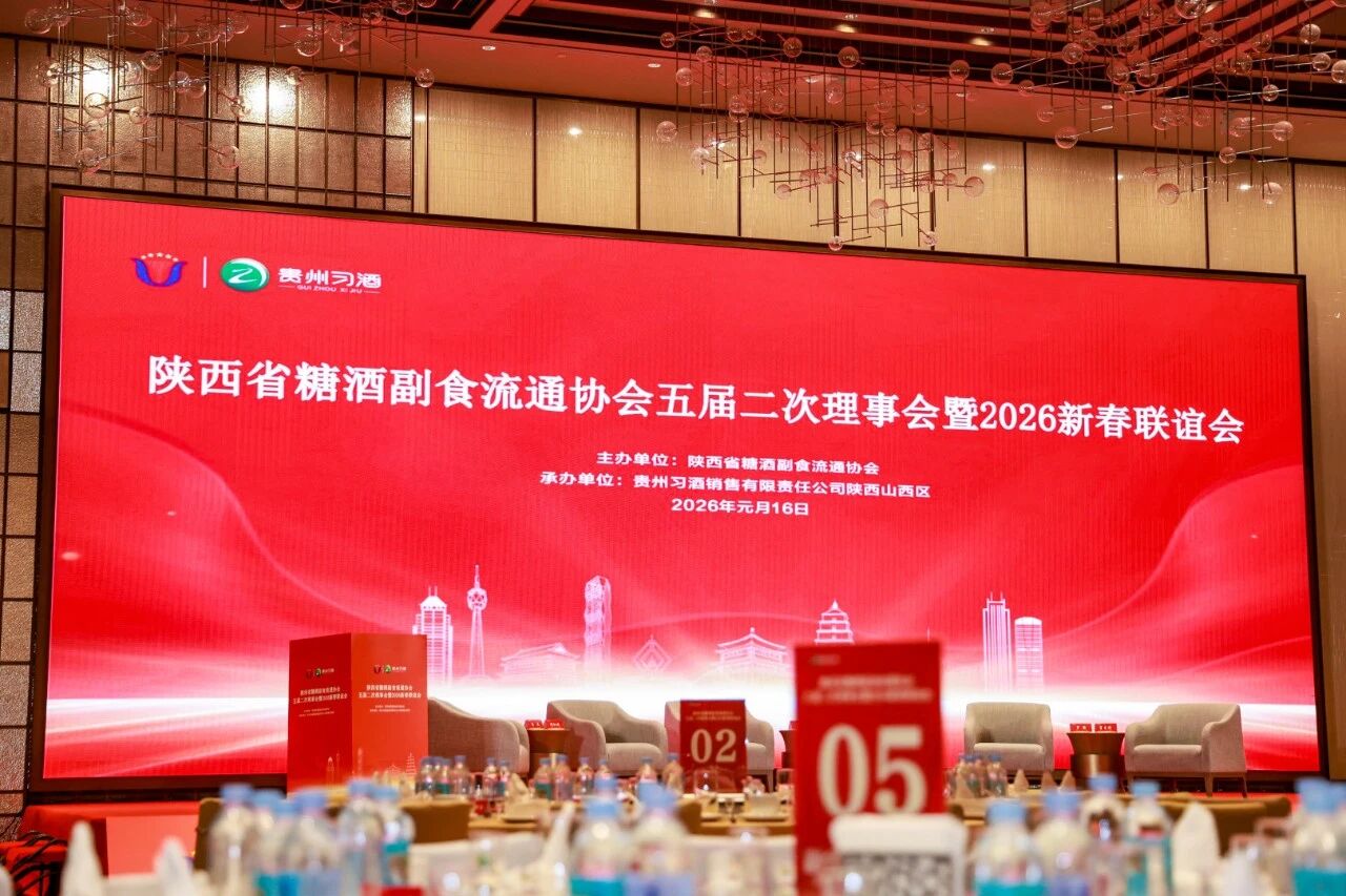 1月16日,陕西省糖酒副食流通协会五届二次理事会暨2026新春联谊会在西安洲际酒店举行。本届大会由陕西省糖酒副食流通协会主办,贵州习酒销售有限责任公司陕西山西区承办,省商务厅有关部门同志和省市场监督管理局有关部门负责人出席会议,来自全省糖酒副食流通行业的企业代表、协会会员单位、有关商协会负责人、新闻媒体代表300 余人齐聚一堂,本次大会旨在系统总结协会第五届理事会2025年的工作成果与经验,共同分析当前陕西糖酒副食流通行业面临的新形势与新机遇,并擘画2026年的发展蓝图,这场承前启后、凝聚行业力量的酒业盛会。