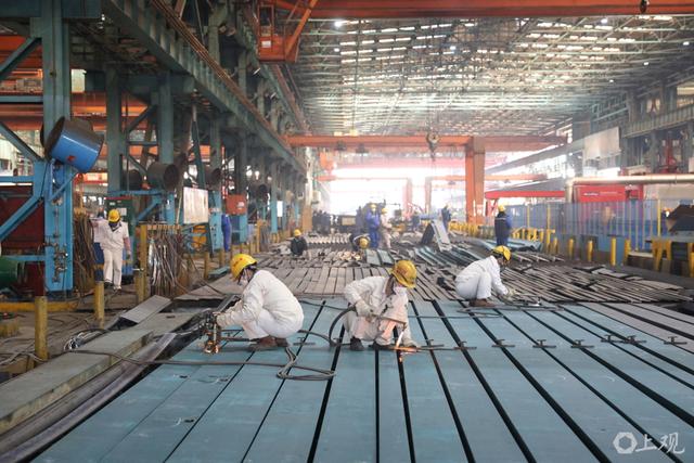 新年伊始,集团旗下沪东中华造船(集团)有限公司长兴岛新厂区一派繁忙,在建船舶停满船坞,单个船坞内便有四艘同时在建;待交付的船舶披上彩妆屹立于码头,内部忙着进行设备调试;加工车间内机器轰鸣火花四起,工人和协作默契,将一片片钢板加工成分段组件,周而复始形成闭环。