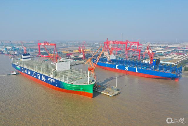 即将建成的装箱船,前方绿色的是全球最大的采用LNG为动力的24000TEU级双燃料集装箱船。也即该领域全球最大的绿色环保型船舶。