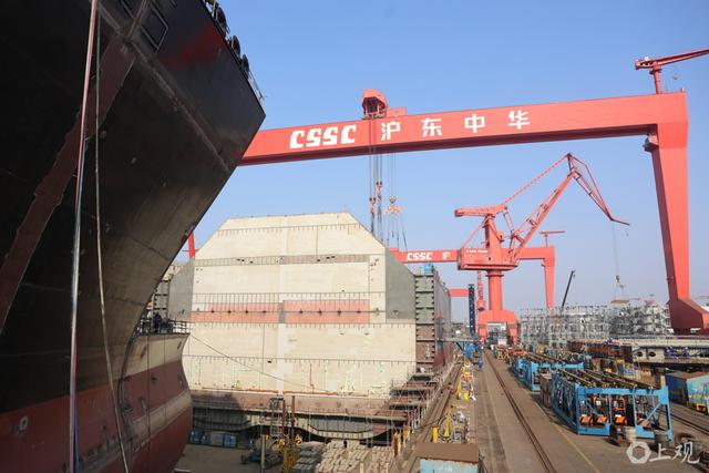沪东中华造船长兴岛基地一派繁忙,单个船坞内便有四艘大型船舶同时在造。