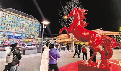 西单商业街上商家摆出的马年吉祥物(1月16日摄)。春节临近,北京市的、西单和前门等商圈悬灯结彩,大批年货上市,浓浓的年味扑面而来。 新华社记者 李欣 摄