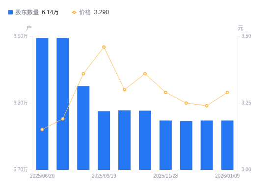 1月19日消息,数据显示,截至2026年1月9日,A股股东总户数为6.14万户,较上期(2025年12月31日)不变。公司最新A股总股本为75.45亿股,其中流通A股75.45亿股,户均持有流通A股数量为12.28万股,较上期不变;户均持流通A股市值40.4万元,较上期增加6140.45元,增幅1.54%。