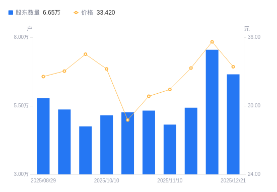 1月19日消息,数据显示,截至2026年1月10日,A股股东总户数为7.19万户,较上期(2025年12月31日)减少2.16万户,降幅23.09%。公司最新A股总股本为4.72亿股,其中流通A股3.82亿股,户均持有流通A股数量为5318.05股,较上期增加1227.87股,增幅30.02%;户均持流通A股市值28.02万元,较上期增加11.46万元,增幅69.15%。