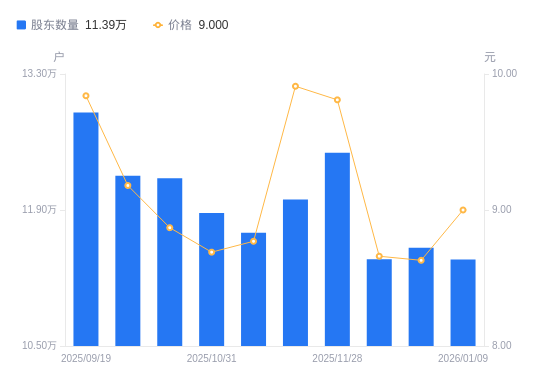 1月16日消息,数据显示,截至2026年1月9日,A股股东总户数为11.39万户,较上期(2025年12月31日)减少1208户,降幅1.05%。公司最新A股总股本为5.67亿股,其中流通A股5.66亿股,户均持有流通A股数量为4970.81股,较上期增加52.16股,增幅1.06%;户均持流通A股市值4.47万元,较上期增加2289.36元,增幅5.39%。