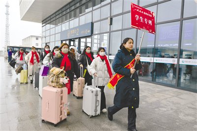 1月19日,乘坐团体包车的大学生在安徽阜阳西站进站乘车。1月19日,G7723次列车从安徽阜阳西站驶出,300余名阜阳高校学子搭乘这趟列车开启寒假回家之旅。这是2026年长三角首趟学生团体包车。 新华社发