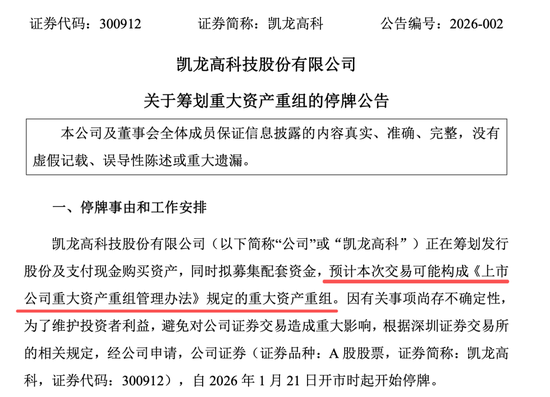1月20日晚间公告显示,凯龙高科正在筹划发行股份及支付现金购买资产,同时拟募集配套资金,预计本次交易可能构成重大资产重组。