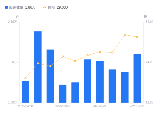1月19日消息,数据显示,截至2025年12月31日,A股股东总户数为1.86万户,较上期(2025年11月28日)增加1372户,增幅7.94%。公司最新A股总股本为1.2亿股,其中流通A股1.2亿股,户均持有流通A股数量为6429.7股,较上期减少510.83股,降幅7.36%;户均持流通A股市值18.67万元,较上期减少1.77万元,降幅8.68%。