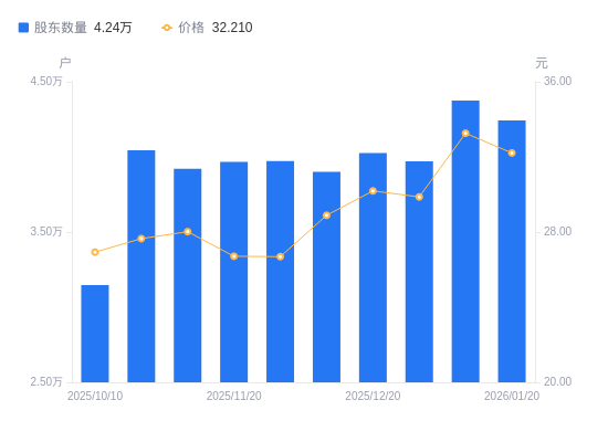 1月21日消息,数据显示,截至2026年1月20日,A股股东总户数为4.24万户,较上期(2026年1月10日)减少1332户,降幅3.04%。公司最新A股总股本为9.78亿股,其中流通A股9.78亿股,户均持有流通A股数量为2.31万股,较上期增加701.71股,增幅3.14%;户均持流通A股市值74.25万元,较上期减少865.31元,降幅0.12%。