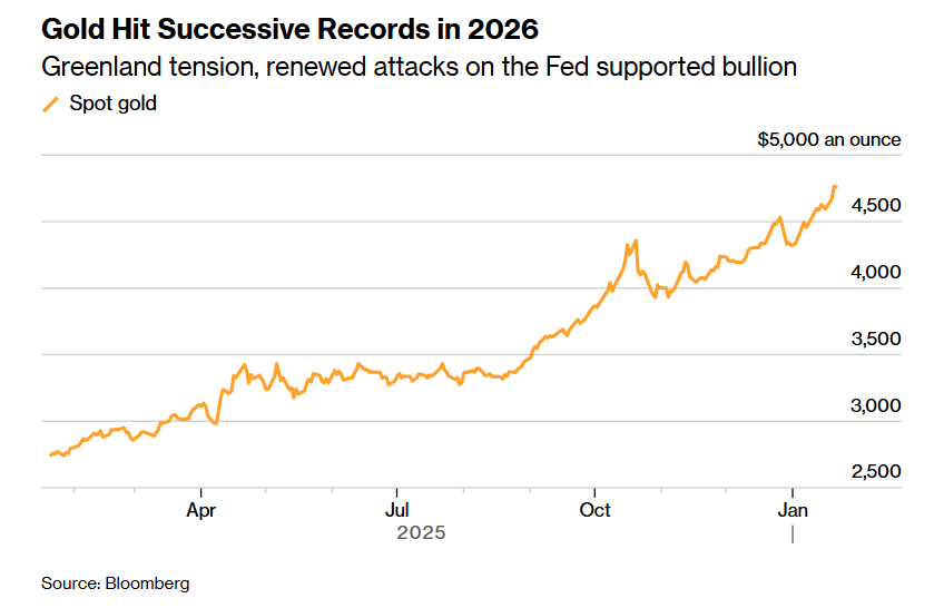 如上图所示,黄金在2026年连续刷新历史纪录——格陵兰紧张局势以及特朗普政府对美联储独立性的再度抨击正在支撑牛市。