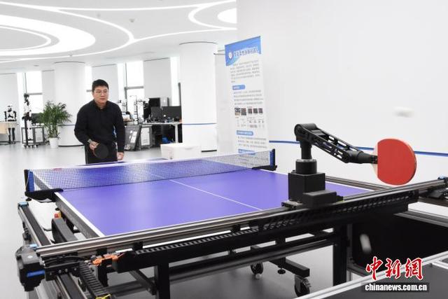1月21日,在河南郑州中豫具身智能实验室,智能机器人于多模态感知及复杂场景内开展训练测试。2024年10月,该实验室正式揭牌,目前其技术成果已在公共服务、文旅融合等诸多领域落地应用。图为智能机器人和工作人员打乒乓球。王宇 摄