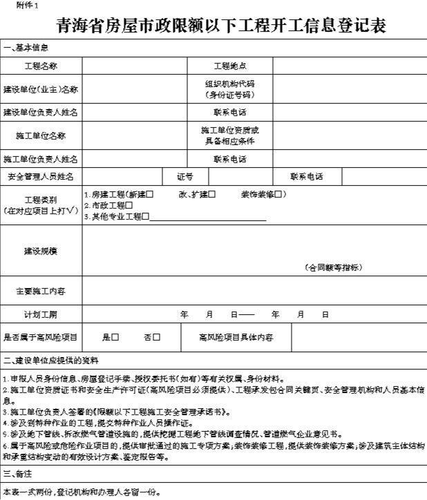 (一)《青海省房屋市政限额以下工程开工信息登记表》。