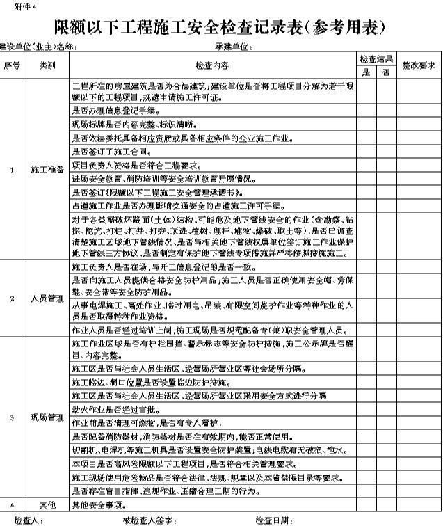 附件 4 限额以下工程施工安全检查记录表(参考用表)