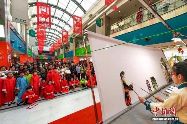 1月24日,由京津冀三地少年宫联合主办的天津市第十七届娃娃庙会在天津启幕。庙会设置了非遗手工艺制作、津味儿非遗美食品鉴、游戏互动等环节。为少年儿童带来一场集视觉、听觉、触觉、味觉于一体的节日盛宴。图为少年儿童观看皮影戏。记者 佟郁 摄