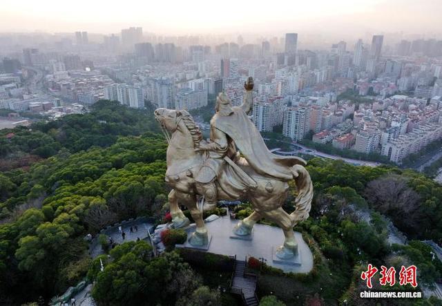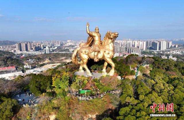 1月24日,福建泉州,游客在郑成功公园游览并与郑成功雕像合影。马年将至,泉州大坪山郑成功骑马铜像成打卡热地,市民游客登山合影,借“马上成功”寄托美好期许。(无人机照片)中新社记者 吕明 摄