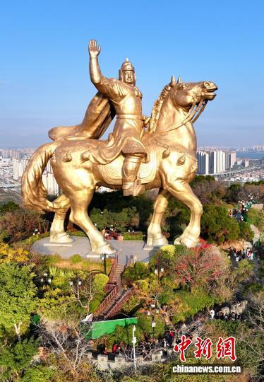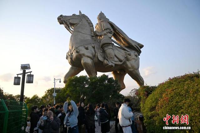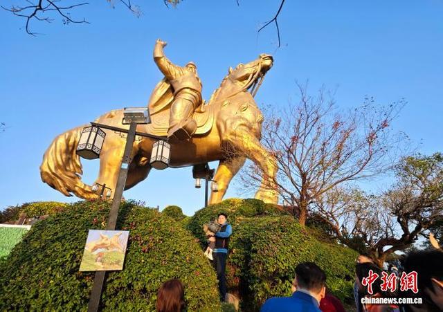 1月24日,福建泉州,游客在郑成功公园游览并与郑成功雕像合影。马年将至,泉州大坪山郑成功骑马铜像成打卡热地,市民游客登山合影,借“马上成功”寄托美好期许。中新社记者 吕明 摄