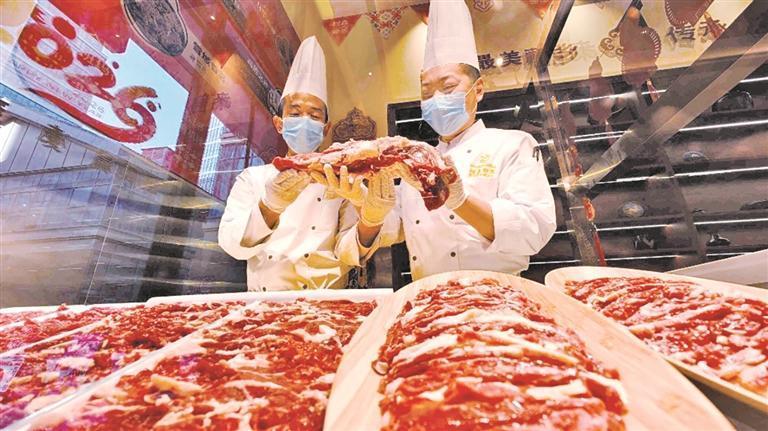 1月23日,西宁一家火锅店内,厨师在分割来自果洛藏族自治州班玛县的新鲜牦牛肉。2025年,该店牦牛肉销量达30吨。这类高原特色产品能跨区域端上城市餐桌,得益于青海冷链物流体系不断完善,也展现出“飞地经济”模式的推广成效。西海新闻记者 祁晓军 摄