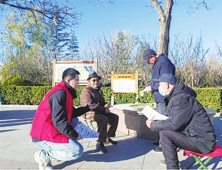 崆峒区民政局工作人员向老人宣讲政策。