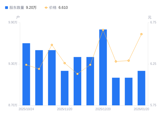 1月23日消息,数据显示,截至2026年1月20日,A股股东总户数为9.2万户,较上期(2026年1月10日)增加1000户,增幅1.10%。公司最新A股总股本为7.53亿股,其中流通A股7.39亿股,户均持有流通A股数量为8030.26股,较上期减少88.24股,降幅1.09%;户均持流通A股市值5.31万元,较上期增加2014.63元,增幅3.95%。