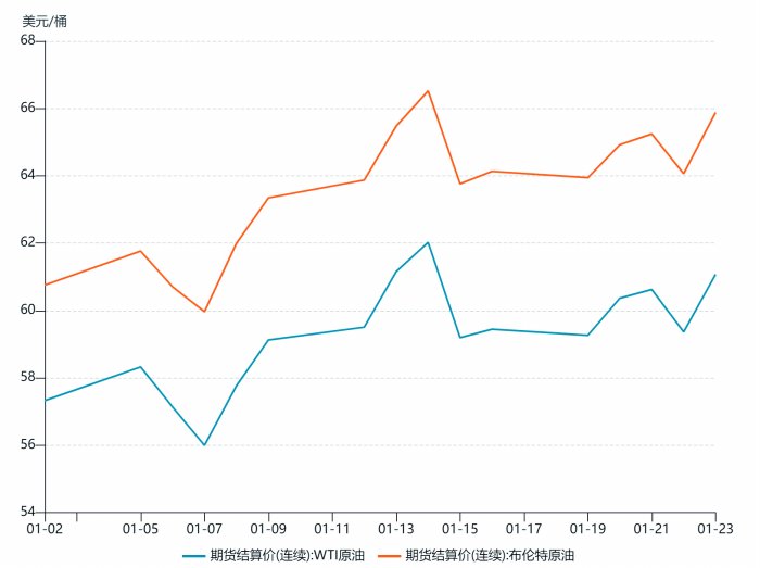从价格角度来看,油价短期小幅走高。1月23日,纽约商品交易所3月交货的轻质期货价格收于每桶61.07美元;3月交货的伦敦布伦特原油期货价格收于每桶65.88美元。
