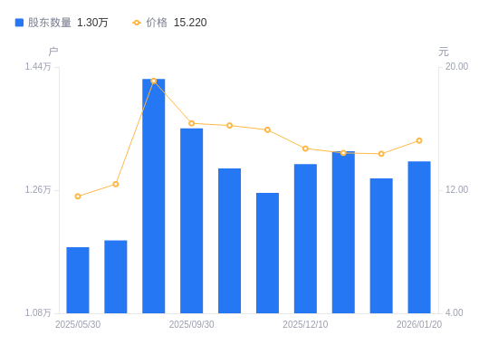 1月26日消息,数据显示,截至2026年1月20日,A股股东总户数为1.3万户,较上期(2025年12月31日)增加246户,增幅1.93%。公司最新A股总股本为1.32亿股,其中流通A股1.06亿股,户均持有流通A股数量为8150.92股,较上期减少156.98股,降幅1.89%;户均持流通A股市值12.41万元,较上期增加4755.53元,增幅3.99%。