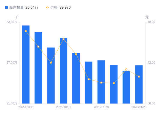 1月26日消息,数据显示,截至2026年1月9日,A股股东总户数为25.82万户,较上期(2025年12月10日)减少8465户,降幅3.17%。公司最新A股总股本为18.14亿股,其中流通A股17.36亿股,户均持有流通A股数量为6724.81股,较上期增加214.91股,增幅3.30%;户均持流通A股市值27.59万元,较上期增加2.2万元,增幅8.68%。