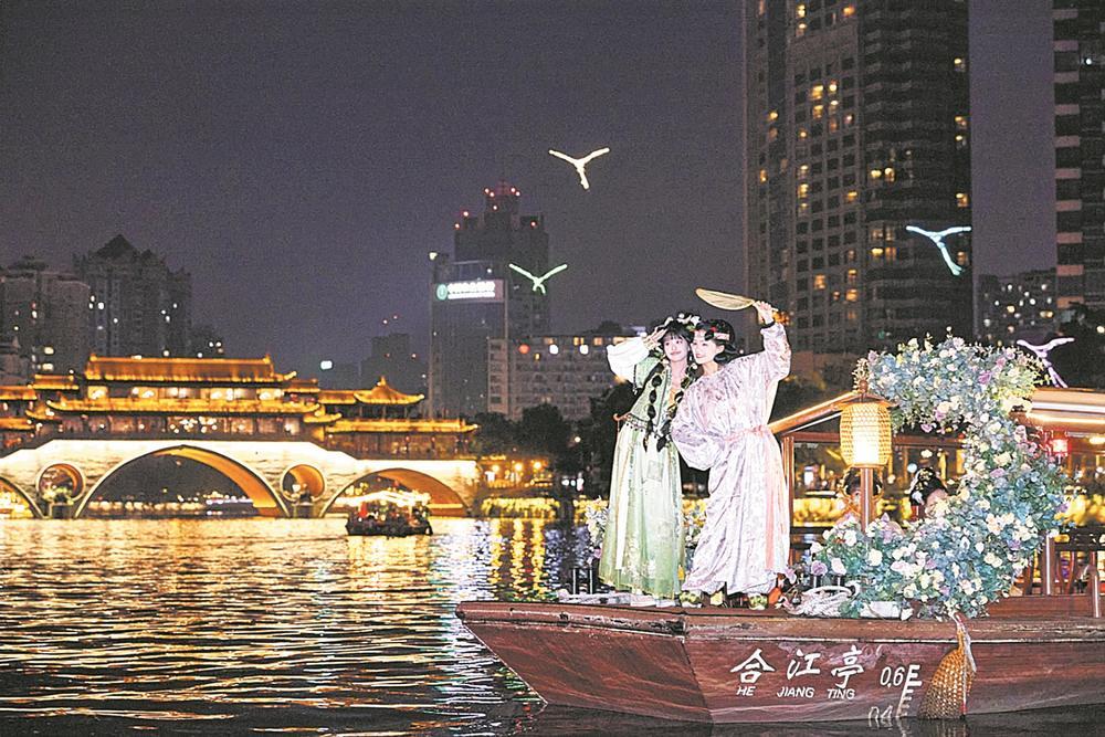 去年武侯祠打造裸眼3D三国胜景,8块LED巨屏构筑流动时空,让游客沉浸式置身蜀汉市集与赤壁之战;杜甫草堂推出打破观演界限的沉浸式戏剧,游客可与“杜甫”“高适”即兴对诗,还能参与“写给杜甫的三行情书”活动,超40万网友线上投稿;今年元旦假期“夜游锦江”推出“潮起锦江夜·万象开新年”沉浸式主题演绎,NPC以李白、杜甫、薛涛等形象亮相,配合古乐演奏与歌舞表演,营造星河月夜下的沉浸氛围,把锦江打造成流动的情绪体验场。这些举措精准戳中当代人对文化浪漫、松弛感的需求。
