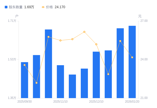 1月29日消息,数据显示,截至2026年1月20日,A股股东总户数为1.69万户,较上期(2026年1月9日)增加114户,增幅0.68%。公司最新A股总股本为1.85亿股,其中流通A股1.51亿股,户均持有流通A股数量为8976.59股,较上期减少61.06股,降幅0.68%;户均持流通A股市值21.7万元,较上期减少1.3万元,降幅5.63%。