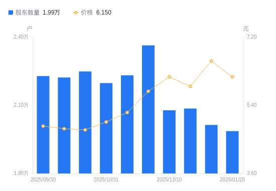 1月29日消息,数据显示,截至2026年1月20日,A股股东总户数为1.99万户,较上期(2025年12月31日)减少272户,降幅1.35%。公司最新A股总股本为5.61亿股,其中流通A股3.31亿股,户均持有流通A股数量为1.67万股,较上期增加224.95股,增幅1.37%;户均持流通A股市值10.24万元,较上期减少5515.6元,降幅5.11%。