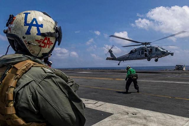 当地时间2026年1月23日,印度洋,美国海军“亚伯拉罕·林肯”号航空母舰(尼米兹级)指挥官丹尼尔·基勒上尉准备驾驶MH-60R“海鹰”直升机。 图