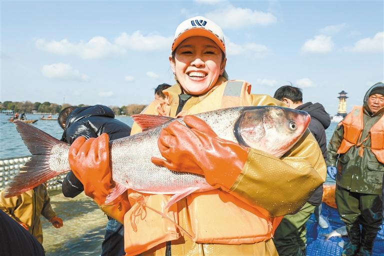 1月31日,在2026溱湖湾冬捕活动现场,市民展示自己参与捕鱼游戏捕获的大鱼。