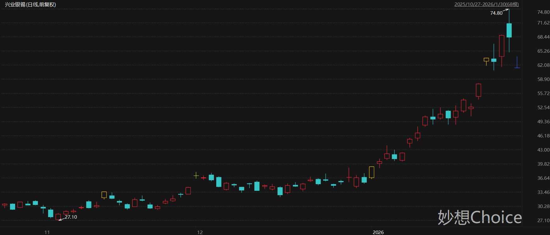 银、锡资源储量规模国内居前的兴业银锡1月6日公告称,公司正在筹划发行境外上市股份(H股)并申请在香港联合交易所有限公司上市事宜。目前,公司正与相关中介机构就本次H股上市的相关工作进行商讨,关于本次H股上市的细节尚未确定。二级市场方面,兴业银锡股价自2025年11月低点迄今累计最大涨幅176%。