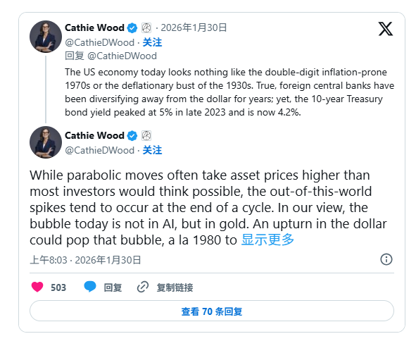 而就在1月30日、金价暴跌12%至5000美元以下,创下自20世纪80年代初以来最大单日跌幅的几个小时前,华尔街明星基金经理、方舟投资的掌门人凯茜•伍德(Cathie Wood)在社交媒体X上发帖暗示,金价接近峰值的可能性正在上升。