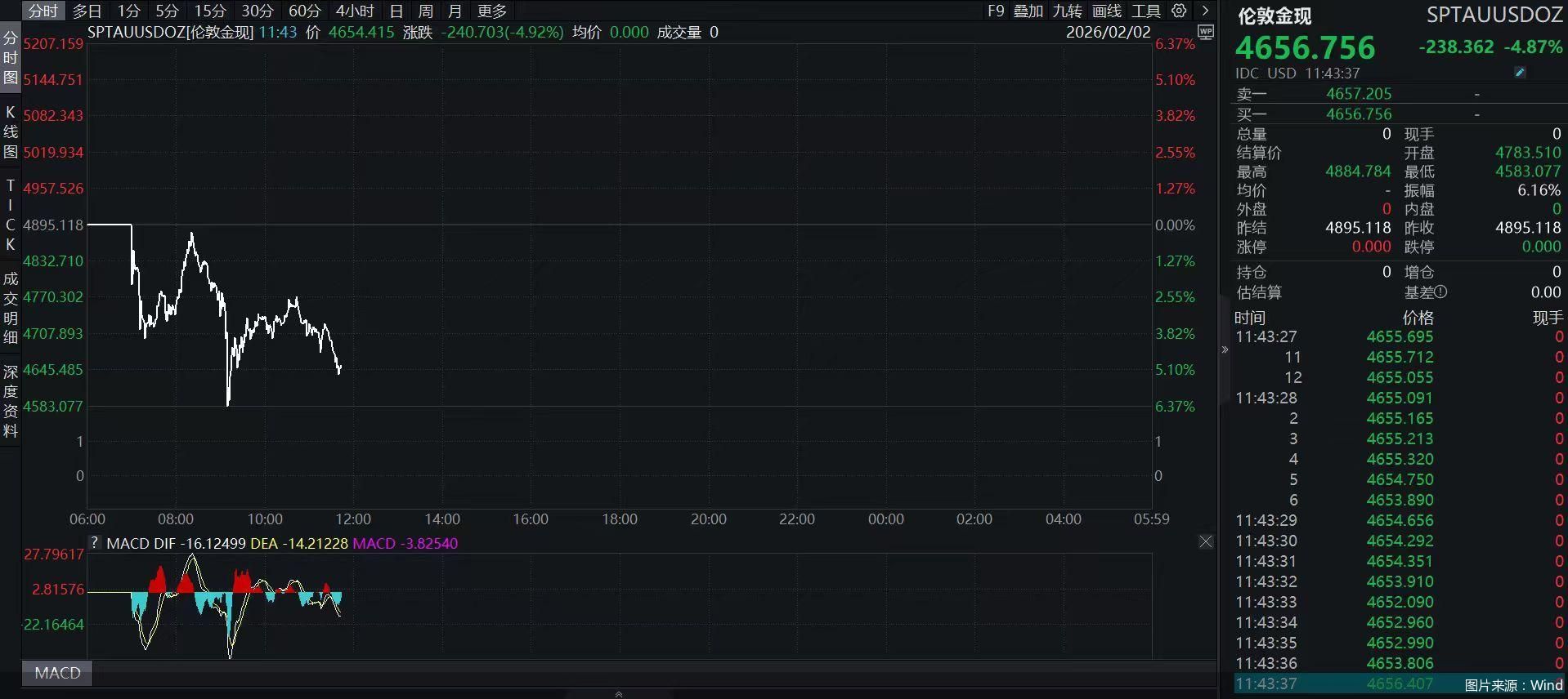 回顾近日,国际金价、银价出现大幅波动。Wind数据显示,伦敦金现自开年以来快速上涨,并在1月29日触及5598.75美元/盎司的历史高点。仅一个交易日后,即1月30日迅速回落,下跌9.25%并跌破5000美元关口。截至2月2日11时30分,单日继续下跌4%,价格在4680美元/盎司附近。