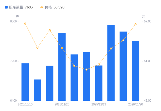 1月30日消息,数据显示,截至2026年1月20日,A股股东总户数为7606户,较上期(2026年1月9日)减少191户,降幅2.45%。公司最新A股总股本为5147万股,其中流通A股2818.06万股,户均持有流通A股数量为3705.05股,较上期增加90.76股,增幅2.51%;户均持流通A股市值20.97万元,较上期增加1.39万元,增幅7.11%。