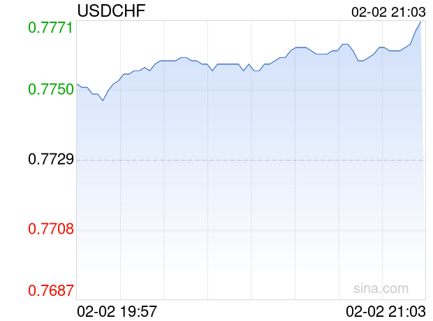 新浪外汇消息2026年02月02日,截至21时03分,外汇市场上美元兑瑞士法郎汇率突破1美元兑换0.7771瑞士法郎。涨幅为0.5434%