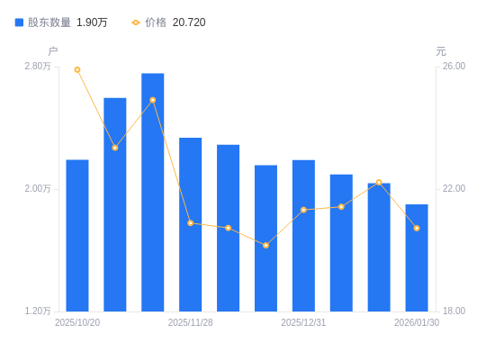 2月2日消息,数据显示,截至2026年1月30日,A股股东总户数为1.9万户,较上期(2026年1月20日)减少1395户,降幅6.84%。公司最新A股总股本为2.22亿股,其中流通A股7816.48万股,户均持有流通A股数量为4115.24股,较上期增加281.56股,增幅7.34%;户均持流通A股市值8.53万元,较上期增加83.44元,增幅0.10%。