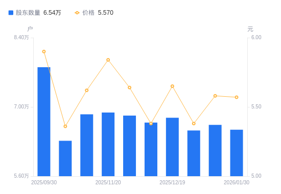2月3日消息,数据显示,截至2026年1月30日,A股股东总户数为6.54万户,较上期(2026年1月20日)减少980户,降幅1.48%。公司最新A股总股本为10.12亿股,其中流通A股9.83亿股,户均持有流通A股数量为1.5万股,较上期增加221.99股,增幅1.50%;户均持流通A股市值8.37万元,较上期增加1088.39元,增幅1.32%。