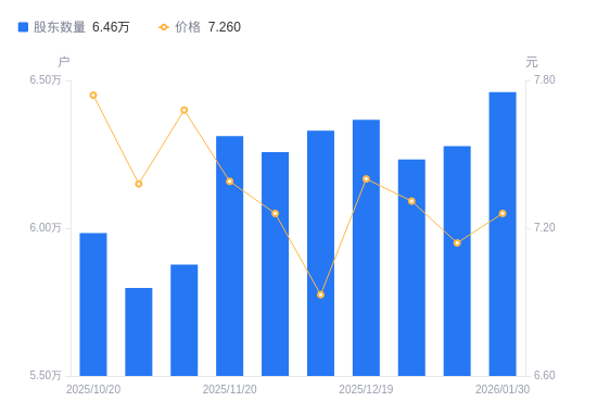 2月4日消息,数据显示,截至2026年1月30日,A股股东总户数为6.46万户,较上期(2026年1月20日)增加1821户,增幅2.90%。公司最新A股总股本为13.65亿股,其中流通A股13.65亿股,户均持有流通A股数量为2.11万股,较上期减少613股,降幅2.82%;户均持流通A股市值15.34万元,较上期减少1840.8元,降幅1.19%。