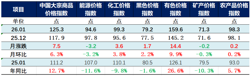 2月5日,由中物联大宗商品流通分会和等单位联合调查,中国物流与采购联合会发布的2026年1月份中国大宗商品价格指数(CBPI)为125.3点,环比上涨6.3%,同比上涨12.7%,创2022年7月以来新高。从指数运行情况来看,一方面,随“两重”“两新”政策加力扩围,“反内卷”政策不断深化,企业预期保持乐观,生产活动延续扩张态势,为“十五五”开局奠定良好基础;另一方面,国际地缘政治深刻演变、货币政策宽松预期、以及大宗商品期货价格剧烈波动,带动国内有色、化工等价格快速上涨,亦带来多重挑战。当前国际金融市场动荡明显加大,部分大宗商品上涨过快,需高度重视并加强外部输入性风险研判,加大宏观政策调节力度,维护产业链供应链稳定。