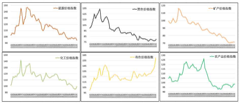 分行业看:有色价格指数大幅上涨,报159.6点,月环比上涨9.9%,年同比上涨26.6%;化工价格指数快速上行,报99.3点,月环比上涨3.8%,年同比下跌9.8%;黑色价格指数继续回升,报79.2点,月环比上涨2.2%,年同比下跌1.6%;价格指数小幅走高,报98.3点,月环比上涨0.2%,年同比上涨5.7%;矿产价格指数小幅回落,报71.3点,月环比下跌0.3%,年同比下跌10.3%;能源价格指数弱势下行,报94.6点,月环比下跌3.2%,年同比下跌11.6%。
