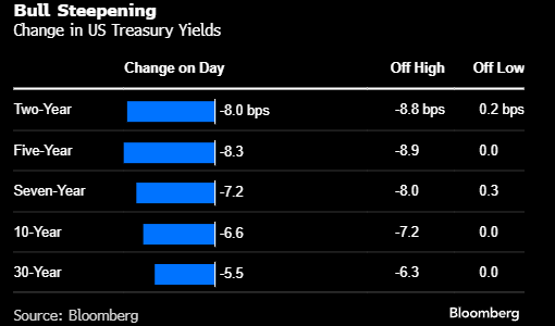 受职位空缺报告和首次申领失业金人数影响,担保隔夜融资利率(SOFR)期货收益率下跌约9个基点。与此同时,债券收益率曲线持续呈“牛陡”形态,这同样反映了近期利率下行的预期。10年期国债收益率迈向近三个月来的最大单日跌幅。考虑到债券波动率自11月中旬以来一直呈下降趋势,这一剧烈波动或许会让市场感到有些措手不及。