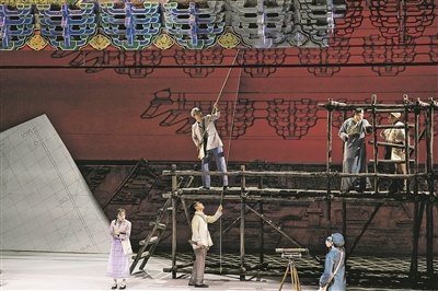 王琛透露,舞台上关键的古建筑构件均严格按照1∶1的真实比例复原制作,当它们悬置于观众面前,一种视觉上的“冲击力”油然而生,“观众能直观体会到剧中人物每日工作的物理尺度和精神重量,体会测绘队员是以怎样的血肉之躯攀爬、丈量并挽留这份巍峨的文明。”舞台地面,北平时期中轴线的建筑脉络化为起伏线条,如纸张般弧形掀起,“寓意着古城文明在战火中飘摇欲飞却又根基深植的命运。建筑的‘实’代表文明遗产,图纸的‘虚’代表传承意志,虚实明暗的衔接过渡,共同凝固了那段惊心动魄的历史。”