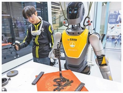 湖北武汉,人形机器人跟着训练师练习写字。薛 婷摄(影像中国)