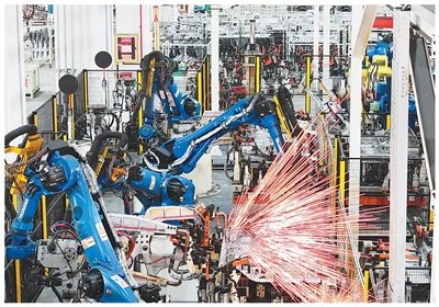 江苏扬州,汽车配件制造企业的工业机器人进行作业。孟德龙摄(影像中国)